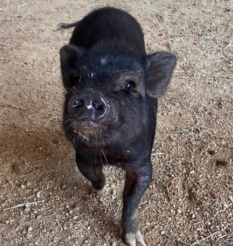 Was found scared, cold, and discarded like trash in a dumpster. A kind-hearted passerby heard what sounded like a baby crying and discovered this sweet female pig in the dumpster. We named her Treasure because one person’s trash is another person’s treasure. She is the first to greet new guests at the farm :)